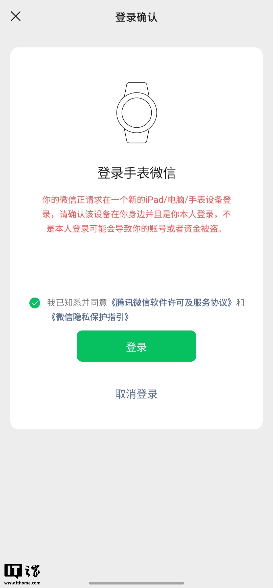 用户登录手表端微信时,手机端 App 将提示 iPad / 电脑 / 手表设备登录请求。完成登录后,手机端 App 也会在顶部提示“手表微信已登录”(点击可进入页面管理微信登录设备)。