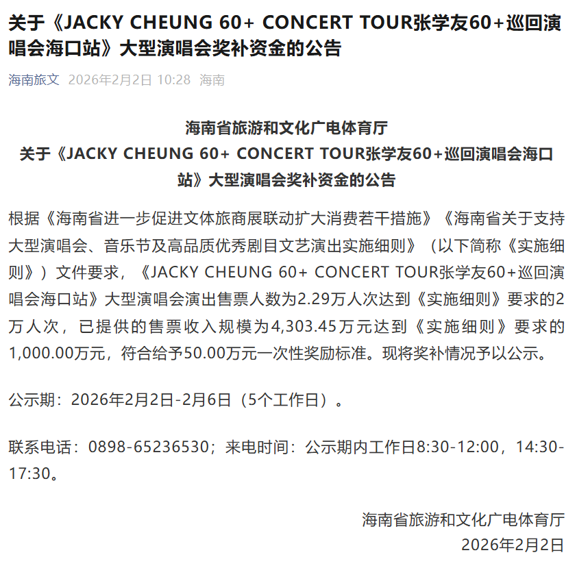 据公告,根据海南相关文件要求,《JACKY CHEUNG 60+ CONCERT TOUR张学友60+巡回演唱会海口站》大型演唱会演出售票人数为2.29万人次达到《实施细则》要求的2万人次,已提供的售票收入规模为4,303.45万元达到《实施细则》要求的1,000.00万元,符合给予50.00万元一次性奖励标准。现将奖补情况予以公示。
